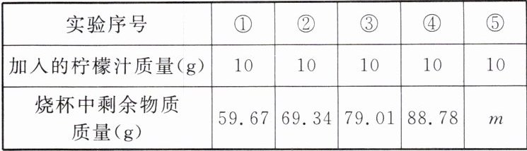典例5 小科学完酸的性质后,通过实验粗略测定现榨柠檬汁中柠檬酸的含量,先称取50g碳酸氢钠溶液于烧杯中,并将50g柠檬汁平均分成五次加入烧杯中,实验数据如表所示:(柠檬酸与小苏打反应的化学方程式为$C_{6}H_{8}O_{7}+3NaHCO_{3}=C_{6}H_{5}Na_{3}O_{7}+3H_{2}O+3CO_{2}\uparrow$)