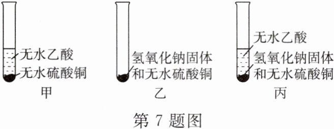 如图所示,取甲、乙、丙三支洁净的试管,向试管甲中加入无水乙酸和无水硫酸铜,向试管乙中加入氢氧化钠固体和无水硫酸铜,向试管丙中加入无水乙酸、氢氧化钠固体和无水硫酸铜,并使试管内的试剂充分混合(已知:无水硫酸铜为白色粉末,遇水生成蓝色晶体)。