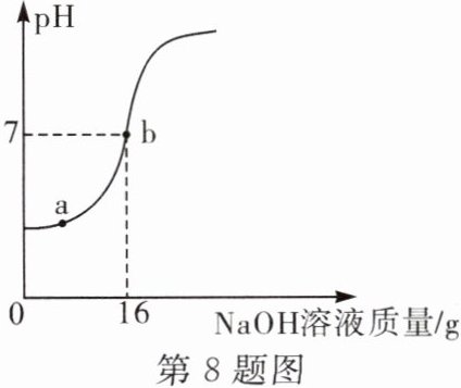 8. 实验室欲测定一瓶标签破损的稀硫酸溶质质量分数。现取 $ 10 $ g 稀硫酸样品,将 $ 5\% $ 的 $ {NaOH} $ 溶液逐滴加入到样品中,边加边搅拌,随着 $ {NaOH} $ 溶液的加入,溶液 $ {pH} $ 的变化情况如图所示。