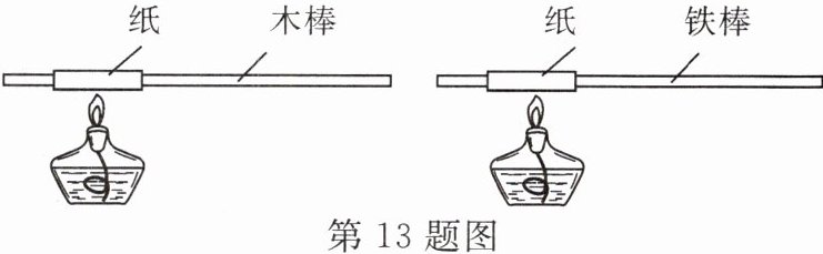 13. 小明将纸条分别紧紧卷在木棒和铁棒上,加热纸条(如图所示),木棒上的纸条立即燃烧,而铁棒上的纸条不会立即燃烧。据此推测木棒和铁棒具有不同的(
