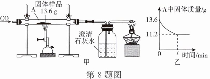 8. 某科学兴趣小组的同学对一份固体样品进行了探究。通过实验已确定该样品由氧化铁和铁粉混合而成。他们称取了 13.6 g 固体样品,用图甲所示的装置继续实验,测定的部分数据如图乙所示。