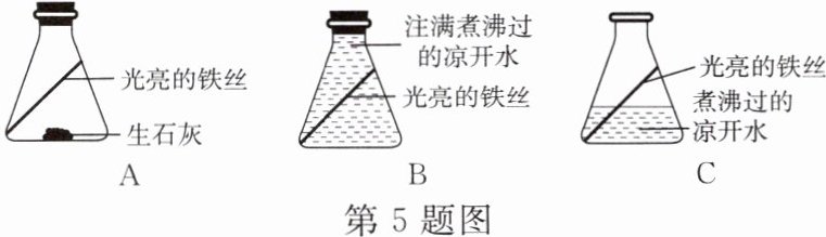 5. 室外的铁制栏杆在多雨季节易生锈,小宁对铁生锈的条件进行了探索,实验装置如图。3 天后,发现只有装置 C 中的铁丝生锈了。