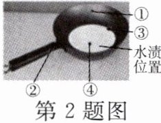 2. 小明在清理厨房后未将铁锅中的水渍擦干(如图),放置过程中铁锅最先生锈的部位为 (
