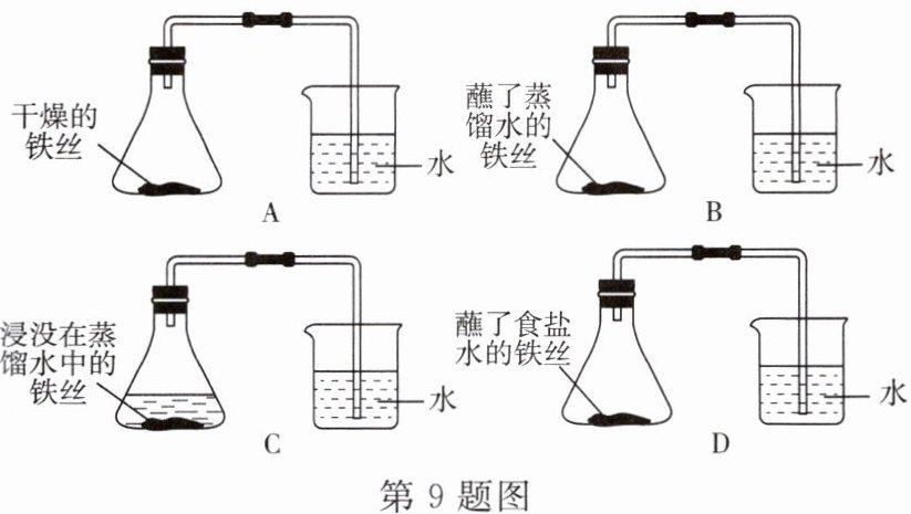9. 在入役 10 年后,“辽宁”舰正式返回大连造船厂进行维护。进入船坞的“辽宁”舰可谓是“饱经风霜”,舰身上挂满了锈迹。同学们设计了如图所示的 4 个实验,探究“辽宁舰”锈蚀的主要原因。实验结果显示:B、D 实验中铁生了锈,而 A、C 实验中没有明显的现象,仔细分析这 4 个实验,回答下列问题: