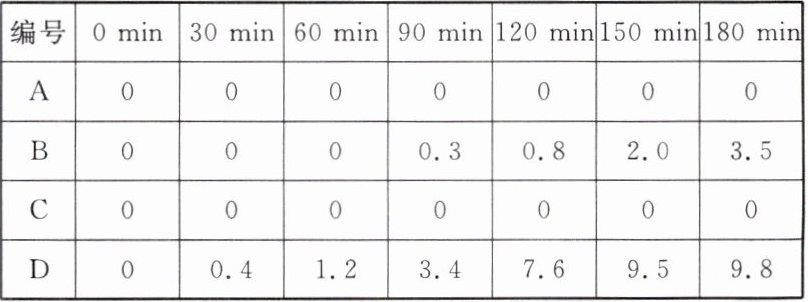 实验时,每隔一段时间测量导管内水面上升的高度,结果如表所示(表中所列数据为导管中水面上升的高度,单位:cm)