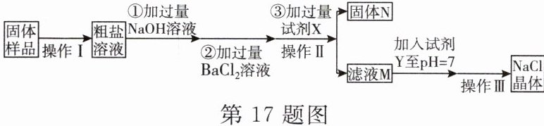 17. 在除杂质的操作中,为了将杂质完全去除,通常需加入过量的除杂试剂。为了除去${NaCl}$样品中混有的少量${Na_{2}SO_{4}}$和${MgCl_{2}}$,某校科学课外活动小组设计的提纯流程如图所示。