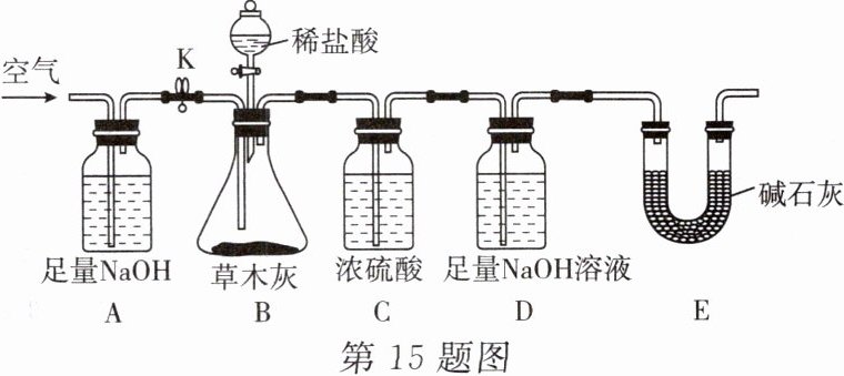 15. “灰水粽”是指用草木灰的浸出液(俗称“灰水”)浸泡糯米做成的粽子,这种粽子颜色微黄、清香软糯。已知草木灰中富含钾盐,主要成分是${K_{2}CO_{3}}$,还有少量${KCl}$。为了检验草木灰的成分,并测试草木灰中${K_{2}CO_{3}}$的质量分数,小佳用图示装置进行实验。