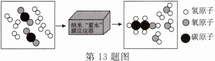 13. 我国科学家在国际上首次以$CO_{2}$和$H_{2}$为原料,在构筑的纳米“蓄水”膜反应器中实现了二氧化碳在温和条件下一步转化为乙醇的反应,该反应微观示意图如下。下列有关说法中不正确的是(