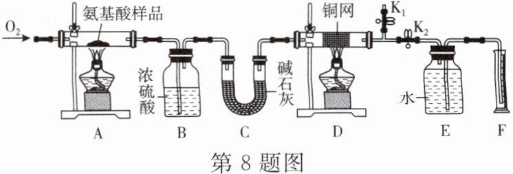 8. 燃烧法是测定有机物分子组成的一种重要方法。现利用燃烧法确定某种氨基酸($ {C_{x}H_{y}O_{z}N_{p}} $)的化学式,实验装置如图所示。(装置气密性良好;装置 B、C、D 中试剂均足量)