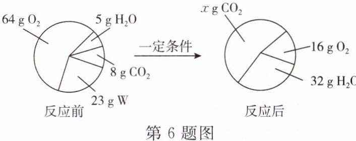 6. 小宁探究了有机物 W 的组成。在一定条件下,W 在密闭容器内发生反应前后各物质的质量如图所示。