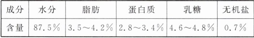 (3)据研究,初中生喝牛奶可以更好地促进生长发育,但缺少乳糖分解酶的人一次摄入乳糖超过 10 g 就会造成腹鸣、腹泻等症状,俗称“乳糖不耐受症”。如表所示为牛奶中的主要成分及含量,对此类学生,下列饮用方式最合理的是(