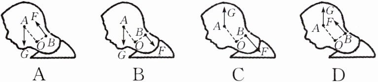 10. 长期低头会对颈部肌肉造成损伤,图中 $ A $ 点为头部重力作用点,$ B $ 点为颈部肌肉施力作用点,下列能正确表示人低头时的杠杆示意图的是 (