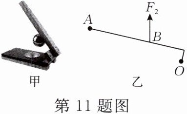 11. 如图甲所示是用来压制饺子皮的“神器”,压皮时压杆可视为一个杠杆,图乙是其简化杠杆示意图。图乙中 $ O $ 为支点,$ F_{2} $ 为压动杠杆时作用在 $ B $ 点的阻力。请在图乙中画出:阻力臂 $ L_{2} $、作用在 $ A $ 点的最小动力 $ F_{1} $。