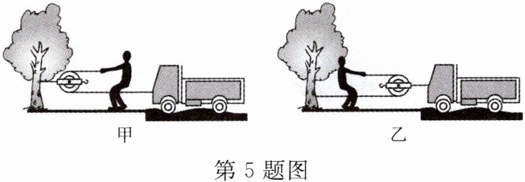 5. 一辆车不小心陷进了泥潭中,小科按如图甲、乙所示两种方法均可将车从泥潭中拉出。如果车受到的阻力为 800N,则下列说法正确的是(