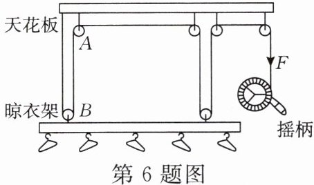 6. 如图是小明家阳台上的手摇晾衣架,衣服和晾衣架的总重为 100N,不计滑轮重、绳重及摩擦。下列说法正确的是(