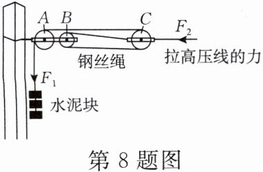 8. 电气化铁路的高压输电线,无论在严冬还是盛夏都要绷直,才能使高压线与列车的电极接触良好,这就必须对高压线施加恒定的拉力,为此,工程师设计了恒拉力系统,其简化原理图如图所示,图中 A 是