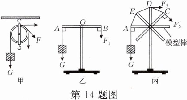 14. [科学探究]如图甲所示,小嘉匀速拉升木块时,发现无论往哪个方向拉弹簧测力计,在不计摩擦和绳重时,F 与 G 的大小都相等。小嘉对此很好奇,在老师的引导下展开了探究。