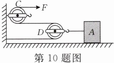 10. 如图所示,物体 A 在拉力 F 的作用下向左匀速直线运动,物体 A 受到地面的摩擦力为 10N(不计滑轮的重及滑轮与绳子之间的摩擦)。则下列说法正确的是(