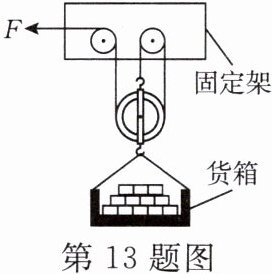 13. 某建筑工地用升降机提升大理石的示意图如图所示。货箱重为 $ 400 \, N $,$ g $ 取 $ 10 \, N/kg $。不计滑轮和钢丝绳的重力,不计摩擦。求: