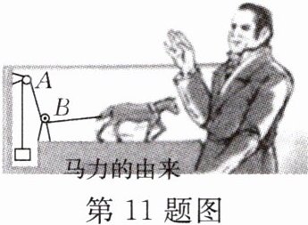 11. 汽车行业经常用“马力”来描述车的动力性能。该词源自 18 世纪,瓦特利用一匹马匀速拉动 $ 4500 \, N $ 的重物(如图所示),该马在 $ 1 \, min $ 内将重物提升了约 $ 10 \, m $,瓦特便将这匹马在平均 $ 1 \, s $ 内所做的功称为 $ 1 $ 马力(不考虑绳重和摩擦)。