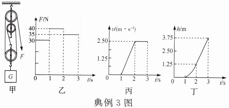 典例3 为了将放置在水平地面上且重为84N的重物G提升到高处。小宁设计了如图甲所示的滑轮组装置。当小宁用如图乙所示随时间变化的竖直向下拉力F拉绳时,重物的速度v和上升的高度h随时间t变化的关系图像分别如图丙和丁所示。若重物与地面的接触面积S=5×10⁻²m²,不计摩擦和绳重。求: