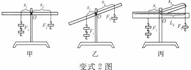 实验1:在直杠杆水平平衡时(如图甲所示)进行实验,记录多组数据得出:F₁×s₁=F₂×s₂(注:s₁和s₂分别表示支点O到F₁和F₂的作用点的距离)。在直杠杆倾斜平衡时(如图乙所示)进行实验,也得到了同样的结论。
