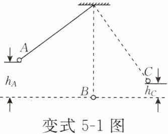 变式5-1 如图所示,小球在A点由静止开始释放并向右侧摆动,B点是小球摆动的最低点,C点是小球摆到右侧的最高点,且A、C两点到B点所在水平面的竖直距离h_A>h_C。下列说法中,不正确的是(