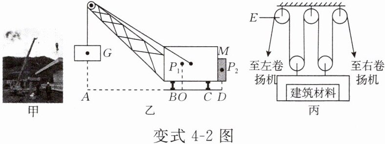 变式4-2 如图甲所示是铁路修建时用到的某型号起重机,如图乙所示是该起重机的示意图。起重机重3×10⁴N(包括悬臂),重心为P₁,为了使起重机起吊重物时不倾倒,在其右侧配有配重M,重心为P₂,现测得AO为9m,OB为1m(g取10N/kg)。