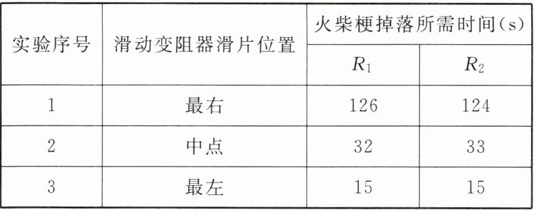 (2)分析实验1、2、3,滑片向左滑动时,滑动变阻器连入阻值减小,电路总电阻减小,由$I = \frac{U}{R}$可知,当电源电压不变时,电路电流增大;电阻$R_1$(或$R_2$)上粘的火柴梗掉落所需时间越短,说明单位时间内电阻$R_1$(或$R_2$)上产生的热量越多。综上所述,电流越大,相同时间内电阻产生的热量越多。