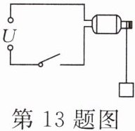 13. 如图所示是电动机提升物体的示意图。电源电压U为120V,电动机将一个质量为50kg的物体1s内匀速提升0.9m,工作时电路中的电流为5A,电动机线圈阻值为6Ω(g取10N/kg)。