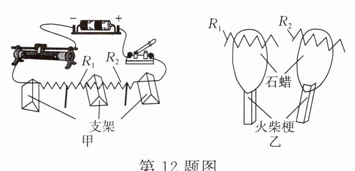 12. [推理论证]小瑞在验证“电阻丝产生的热量与电阻、电流及通电时间的关系”时,采用如图甲所示电路,其中R₁、R₂为不同长度的同种电阻丝(R₁长度大于R₂),取相同的火柴梗用相同大小的石蜡粘在R₁、R₂上(如图乙所示),闭合开关,记录火柴梗掉落所需时间。调节滑动变阻器的滑片,重复实验,结果如表所示: