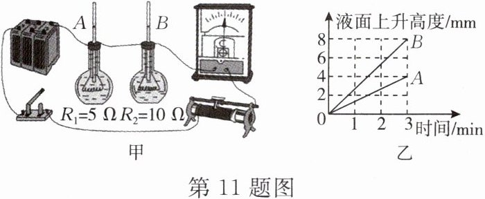 11. 科学兴趣小组用如图甲所示装置进行“探究影响电流热效应的因素”的实验。两个完全相同的烧瓶内装有等量的煤油,瓶内连接的电阻丝的阻值分别为5Ω和10Ω,A、B是相同的玻璃管,管内初始液面位置相同。闭合开关,每隔1min记录液面上升的高度,多次实验后的数据如图乙所示。