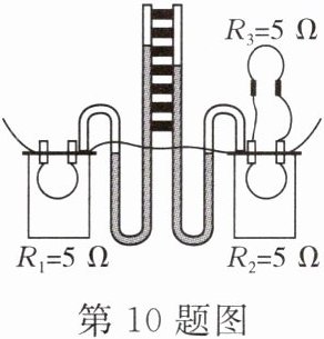 10. 如图所示是探究电流通过导体产生热量的多少和什么因素有关的实验装置。通电一段时间后,左侧容器连接的U形管液面高度差较大,说明电流通过导体产生的热量跟