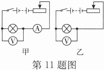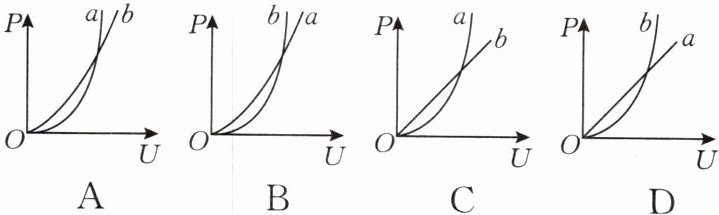 11. 课外兴趣小组活动时,某校两名同学通过实验研究小灯泡的电功率跟两端电压的关系。已知小灯泡的额定电压为2.5 V、额定功率为0.75 W。小明同学设计了如图甲所示的电路进行研究,他先测出若干组电压和电流值,再由P = UI求得对应的功率,并作出功率随电压变化的曲线a。小红同学设计了如图乙所示的电路进行研究,她先由R = $\frac{U_{额}^{2}}{P_{额}}$计算出小灯泡的电阻R,再测出若干个电压值,最后根据P = $\frac{U^{2}}{R}$求得对应的功率,也作出功率随电压变化的曲线b。则下列选项图中能反映他们的实验结果的是(