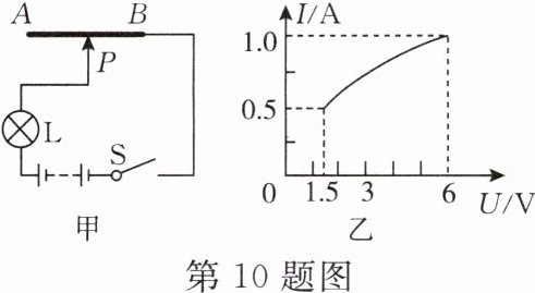 10. 如图甲所示,粗细均匀的电阻丝AB通过滑片连入电路(电阻丝的阻值不随温度变化),小灯泡的额定电压为6 V,滑片P从A端移动到B端的过程中,小灯泡的I - U关系图像如图乙所示。则下列计算结果正确的是(