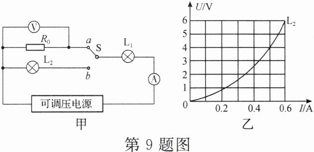 9. 在如图甲所示的电路中,已知电源为电压可调的“直流电源”,灯泡L₁的额定电压为8 V,图乙是灯泡L₂的U - I图像。