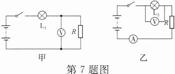 7. 现有电源一个(电压不变),电压表、电流表、定值电阻和开关各一个,导线若干,小灯泡L₁(额定电压为1.2 V)和L₂(额定电压为6 V)。忽略灯泡的电阻随温度的变化。现在利用这些仪器组成电路,若组成如图甲所示电路,电压表读数为5.4 V,L₁实际功率为其额定功率的$\frac{1}{4}$,则L₁实际电压为