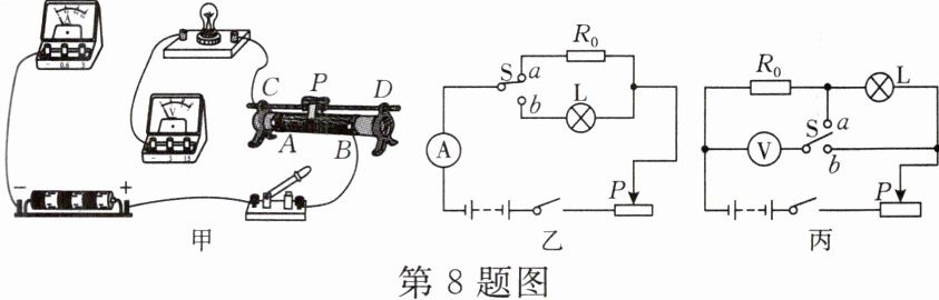 (填“R₁”或“R₂”)。(3) 若增加一个阻值为10 Ω的定值电阻R₀,只利用一只电表,通过简单操作(开关S接“a”与“b”各一次)来测量小灯泡的额定功率,图乙、丙是两种不同方案的电路图,则下列判断正确的是