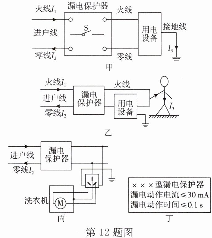12. 如图甲所示,漏电保护器的内部结构相当于一个自动开关 $ S $,正常情况下,住户家中没有电流流向地面,即图中 $ I_{3} $ 为零,进户线中流入的电流 $ I_{1} $ 和流出的电流 $ I_{2} $ 相等,开关 $ S $ 处于闭合状态。如果电路中某处发生漏电(漏电是指电流从墙体、人体、接地线或其他路径流向地面),即图中的 $ I_{3} $ 不为零,就会造成 $ I_{1} $ 和 $ I_{2} $ 不相等,当 $ I_{1} $ 和 $ I_{2} $ 的差异达到一定值,开关 $ S $ 就会立即断开。