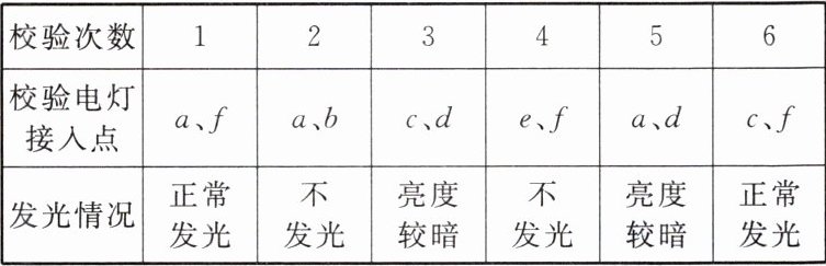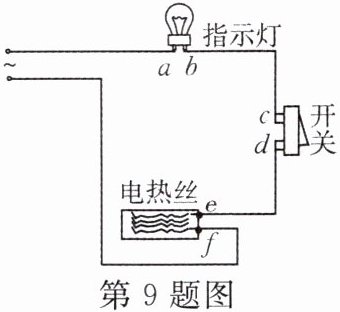 9. 如图所示是一个电热器电路,电热丝、指示灯、开关构成串联电路,接在电源上,闭合开关无法工作。已知该电路中有一个元件断路,有一个元件短路,但不知道是哪两个有故障。现用一个校验电灯分别并联在各处,得到表中所示的结果,根据表格内容可判断(