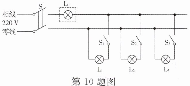 10. 电工师傅常用一只额定电压为 220 V 的灯泡 $ L_{0} $(检验灯泡)取代保险丝来检查新安装的照明电路中每个支路的情况,如图所示。当 $ S $ 闭合后,再分别闭合 $ S_{1}、S_{2}、S_{3} $(每次只能闭合其中之一)时,可能出现以下三种情况,试判断(均选填“短路”“断路”或“正常”):