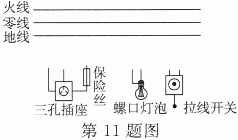 11. 如图所示的插座(带保险丝)和电灯(带开关)是组成家庭电路的常用器件,请你用笔画线代替导线将它们分别接入电路中。