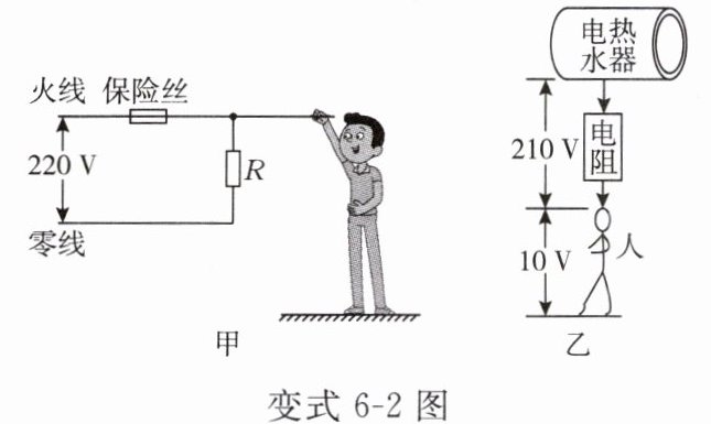 (3)为了保证用电安全,有的电热水器安装了防电墙。防电墙技术就是在电热水器内部形成永久性电阻,从而降低异常情况下经过人体的电流值。经过防电墙处理后,发生异常情况时,人体承受的电压约$10\mathrm{V}$,如图乙所示,这就保证了人体安全。若人体的最大电阻约为$20\mathrm{M}\Omega$,求防电墙的电阻大约是多少?