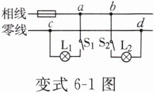 如图所示是家庭电路中的一部分,电工师傅按下面的顺序进行检测:①闭合$S_{1}$,灯$L_{1}$亮;②断开$S_{1}$,闭合$S_{2}$,灯$L_{2}$不亮;③再用测电笔测$a$、$b$、$c$、$d$四个接线点,发现只有在$c$点氖管不发光。若电路中只有一处故障,则是(