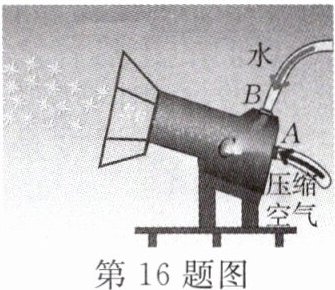 16.A管喷出的“压缩空气”快速膨胀对外做功,内能减小,温度降低。同时高速气流将水变成水雾,增大了水的表面积,部分水雾快速蒸发,形成大量水蒸气。在C处低温环境下,一部分水雾遇冷凝固形成晶核。被高速气流推出的晶核、水雾、水蒸气进入低温的空气中,外界寒冷的环境利于水雾凝固、水蒸气凝华成固体附着在晶核周围,使晶核变大形成小冰晶,小冰晶不断聚集与生长形成雪花。