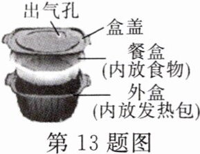 13. 如图所示为一种自热火锅的构件图。该自热火锅的发热包内有铁粉、铝粉、炭粉、生石灰等物质,将发热包放到水中,会放出大量的热。下列有关该自热火锅的说法中,合理的是(
