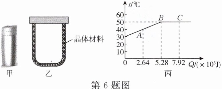 6. 如图甲所示为一款新型水杯,将沸水倒入杯中,轻摇几下后,水温便可降至 $ 55 $ $ ^{\circ}C $ 左右,并能保温 $ 3 $ $ h $。图乙为其内部结构图,杯壁的不锈钢夹层中有晶体传热材料,其在常温下是固态,会随着温度的变化发生可逆的物态变化。取 $ 0.3 $ $ kg $ 该晶体材料,对其进行加热,其温度与吸收的热量关系如图丙所示。下列分析正确的是(