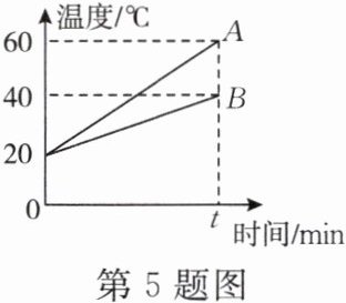 5. 用相同的电加热器分别对质量相等的 $ A $ 和 $ B $ 两种液体加热(不计热量损失),如图所示是 $ A $ 和 $ B $ 的温度随加热时间变化的图像,下列说法正确的是(