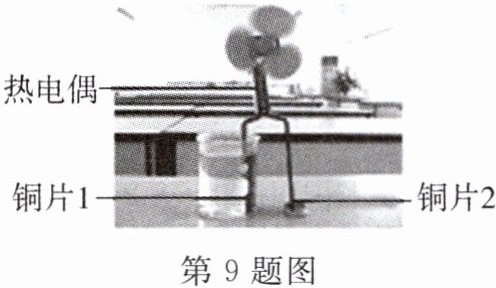 9. 用两块铜片、热电偶、电动机(带风扇)组成一个电路。铜片 1 插在 $90^{\circ}C$ 热水中,铜片 2 放在空气中,如图所示,半分钟左右风扇发生转动,这就是温差发电现象。下列选项正确的是(