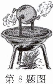 8. 如图所示是古希腊数学家希罗发明的“汽转球”,被誉为最早的蒸汽机。它由一个装有水的密闭锅与一个空心球通过两根空心管连接在一起,球两旁由两根出气管组成。在锅底生火,通过的方式增加水的内能,水沸腾后产生的高温水蒸气由空心管进入球中对球做功,将转化为,就可以使球体快速转动,蒸汽从装置通过并排出后它的温度会。这一过程的能量转化和汽油机的冲程的能量转化形式相同。